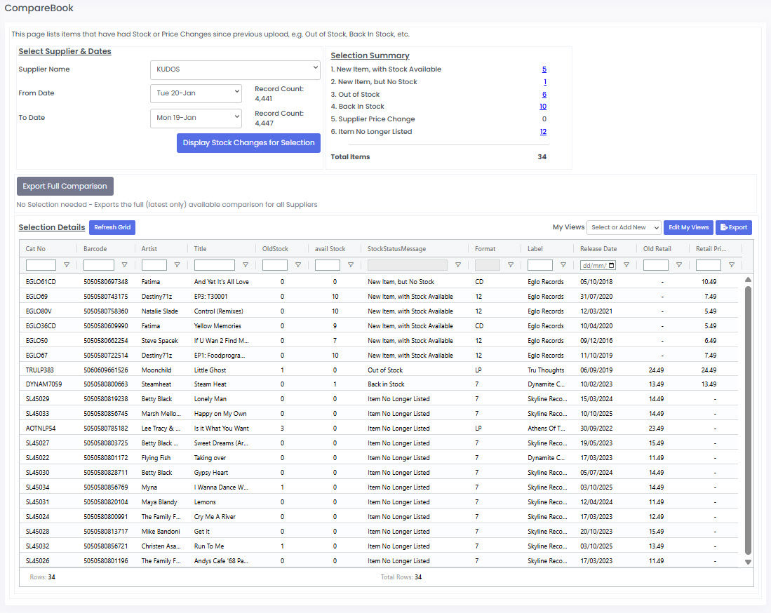 compareBook Compares data between catalogue information for each supplier over specified data ranges, so that users can readily identify new items, items out of stock, back in stock, deletions and price changes. This feature enables retailers to more easily manage items that they do not physically stock, and gain advantage of additional sales opportunities.