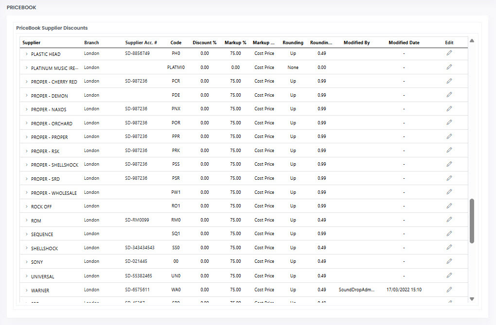 priceBook Enables the Retailer to securely assign all pricing information from each respective supplier, where that information retrieved and calculated for each individual item. These include Discounts, Mark-ups, Rounding information and VAT. Secure user controls ensures only staff with the correct rights have access to sensitive data.